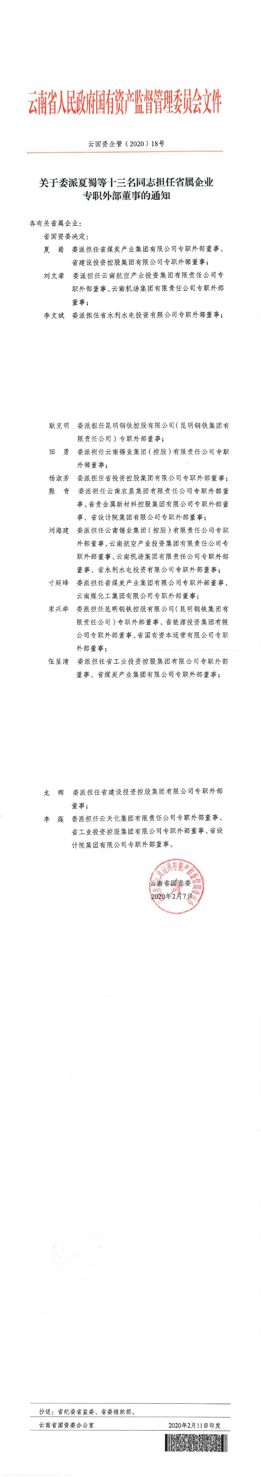 省国资委关于委派杨淑芳等十三名同志担任省属企业专职外部董事的通知