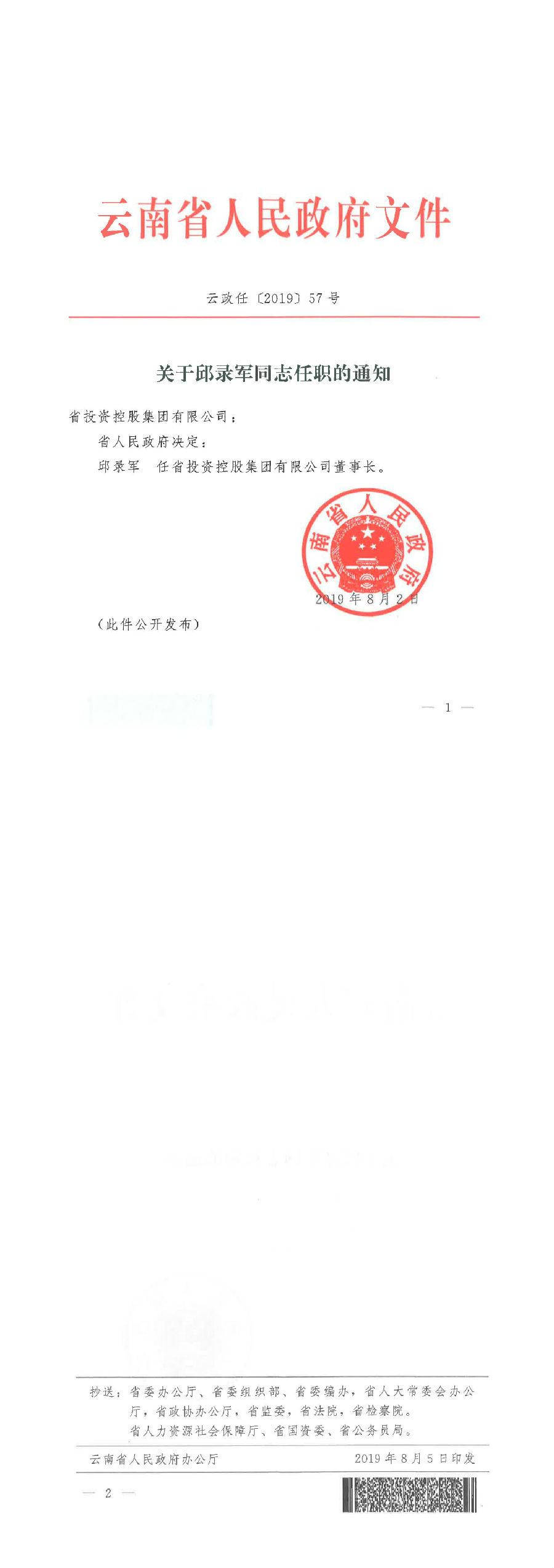 省政府关于邱录军同志任职的通知