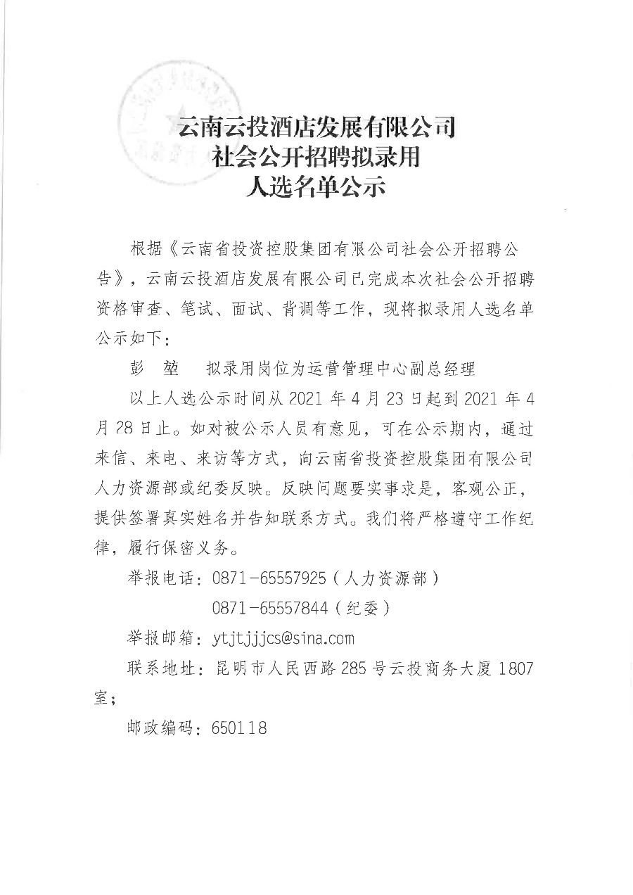 云南云投酒店发展有限公司社会公开招聘拟录用人选名单公示