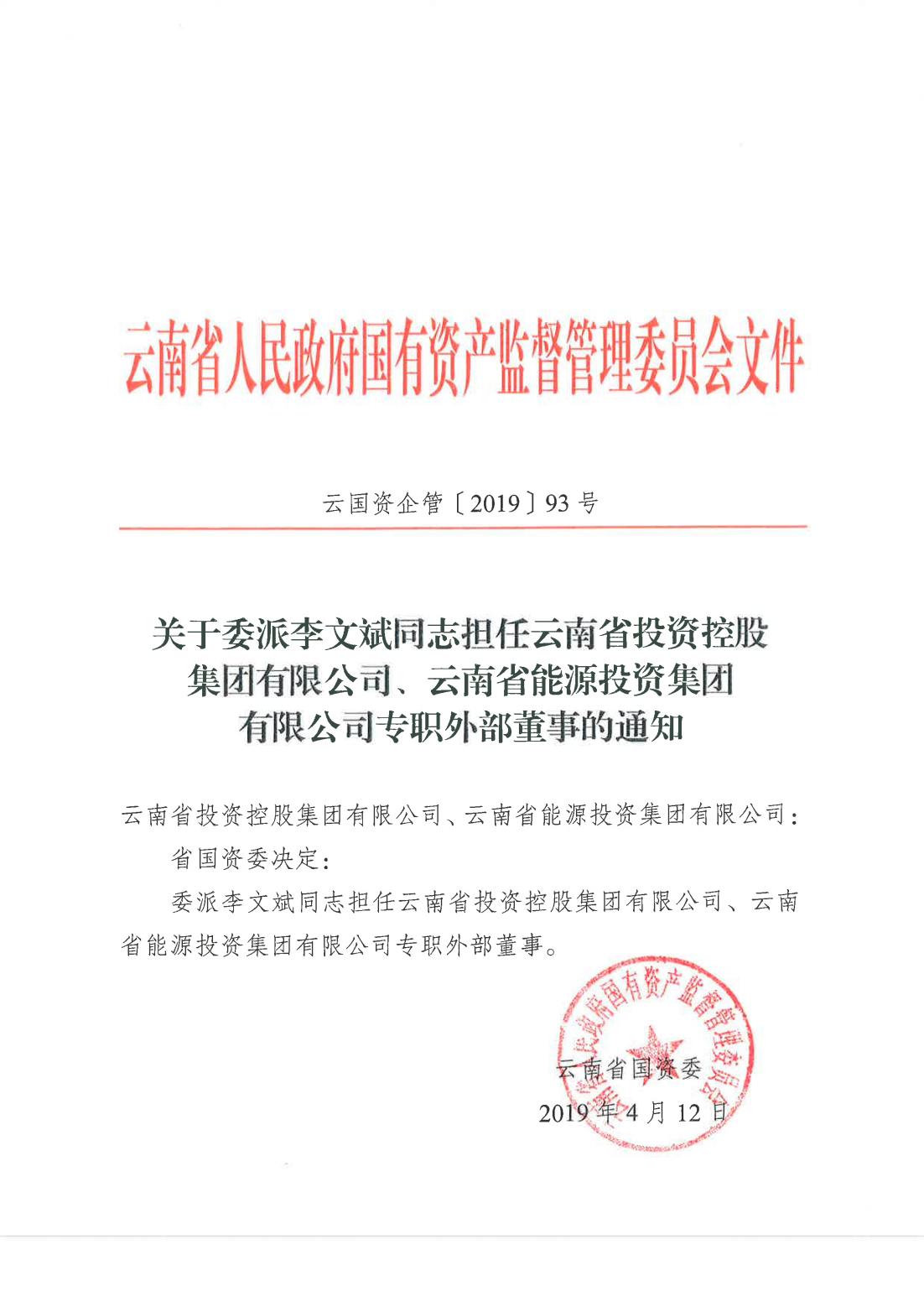 省国资委关于委派李文斌同志担任亚l博体育app下载、云南省菲律宾亚星登录有限公司专职外部董事的通知