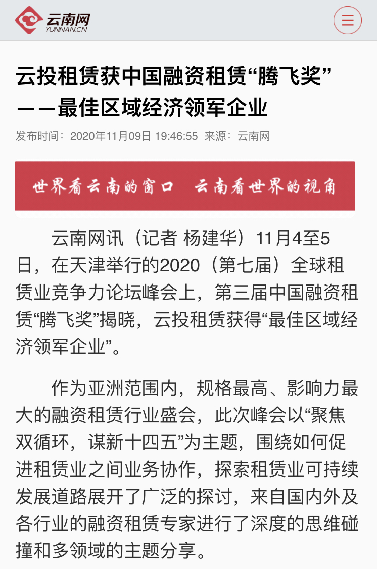 新华网、云南日报、云南网、春城晚报等媒体对云投租赁获中国融资租赁“腾飞奖”进行报道。