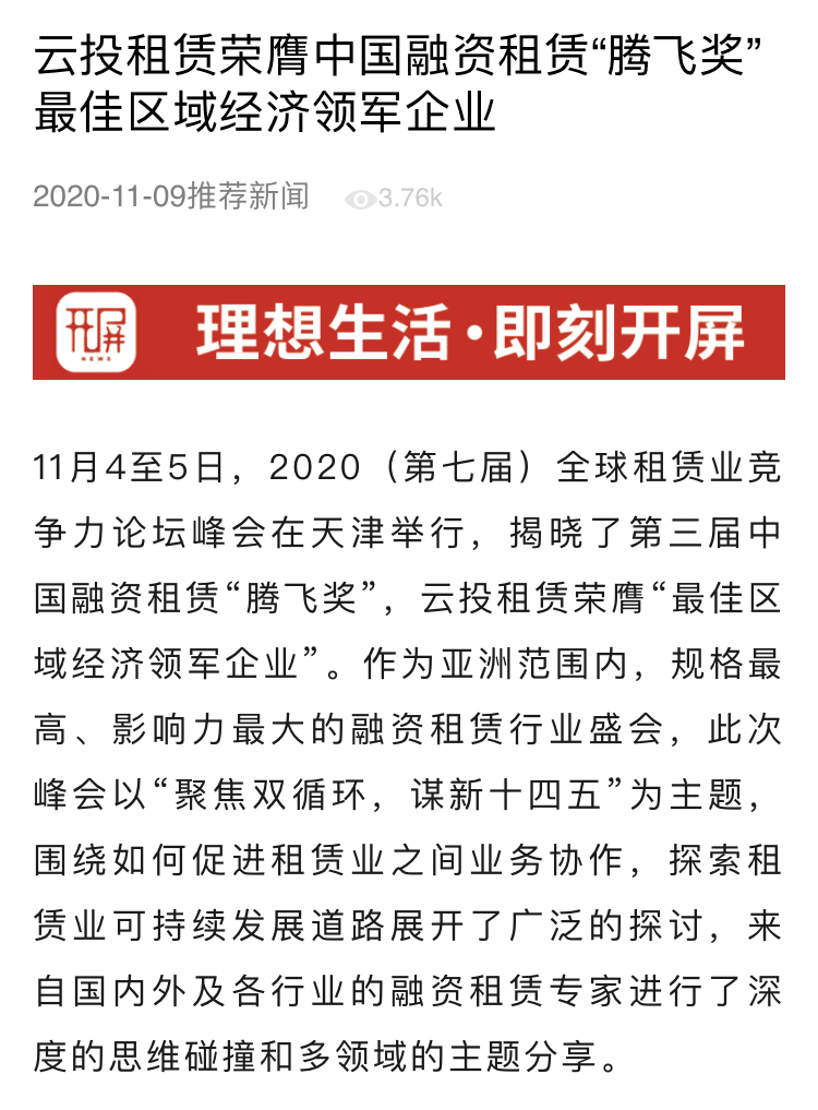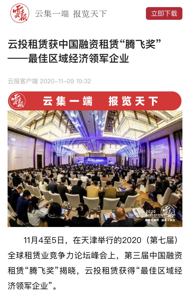 11月4至5日,在天津举行的2020(第七届)全球租赁业竞争力论坛峰会上,第三届中国融资租赁“腾飞奖”揭晓,云投租赁获得“最佳区域经济领军企业”。作为亚洲范围内,规格最高、影响力最大的融资租赁行业盛会,此次峰会以“聚焦双循环,谋新十四五”为主题,围绕如何促进租赁业之间业务协作,探索租赁业可持续发展道路展开了广泛的探讨,来自国内外及各行业的融资租赁专家进行了深度的思维碰撞和多领域的主题分享。