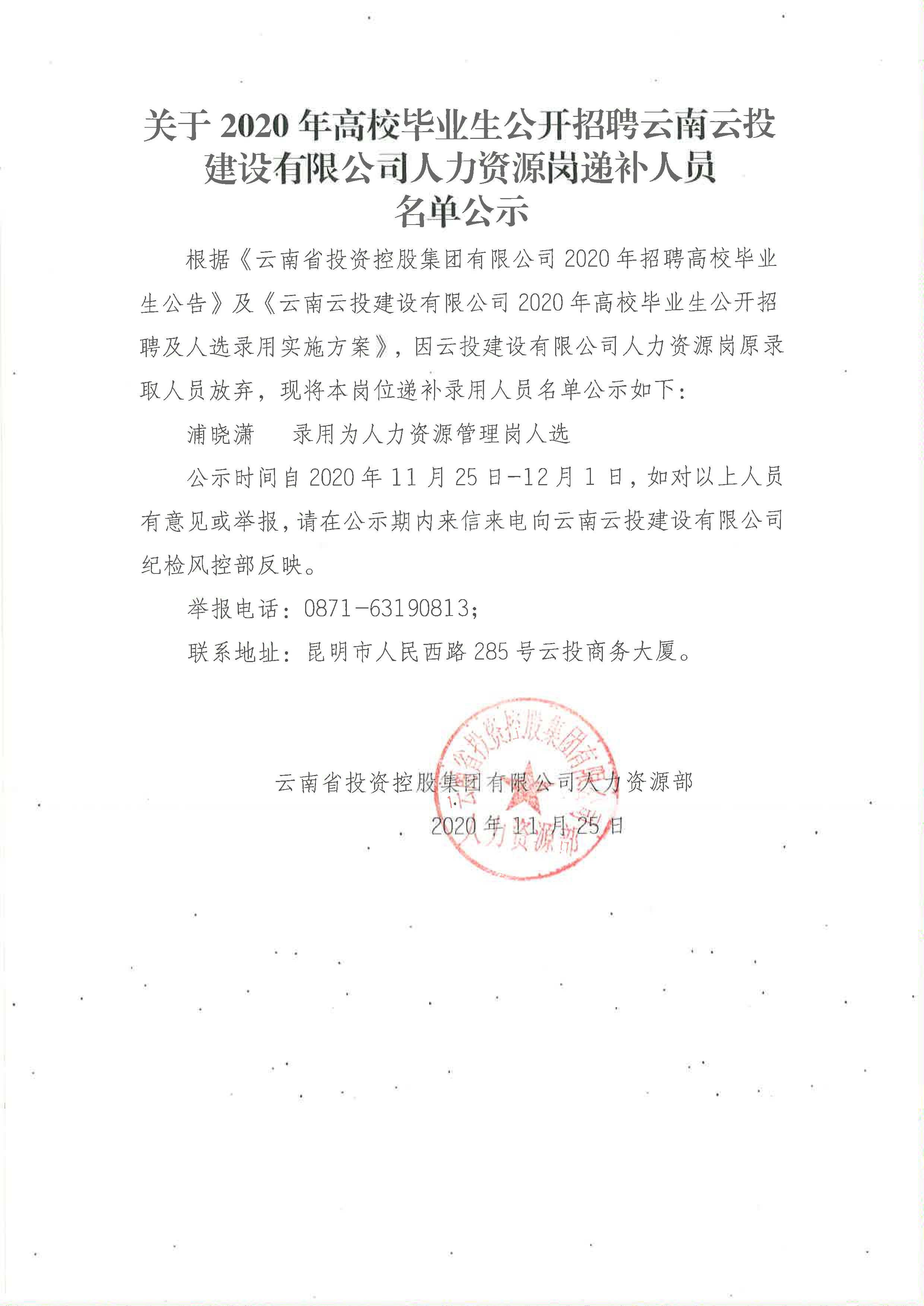 云南云投建设有限公司公开招聘补录人员公示