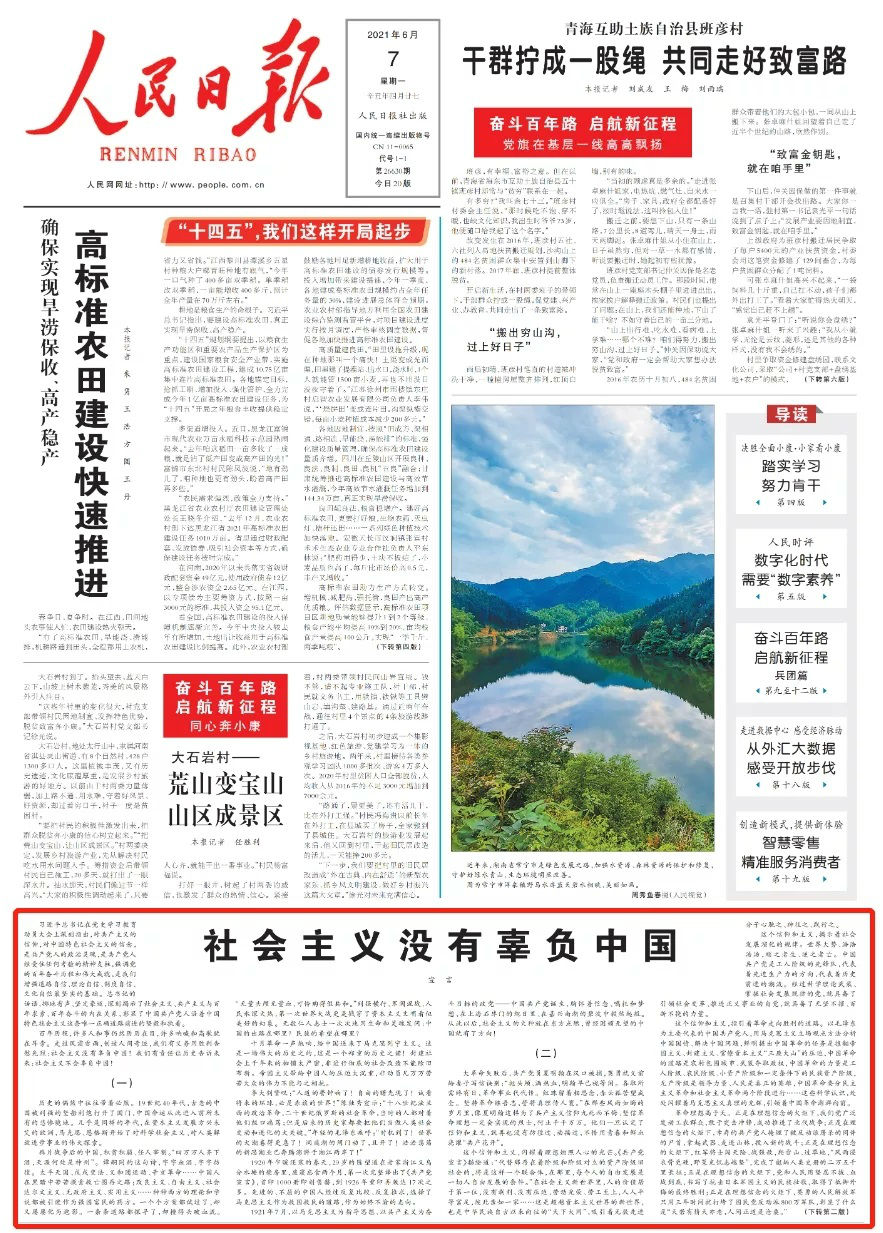 稿件来源:《人民日报》(2021年06月07日第01版),原题《社会主义没有辜负中国》