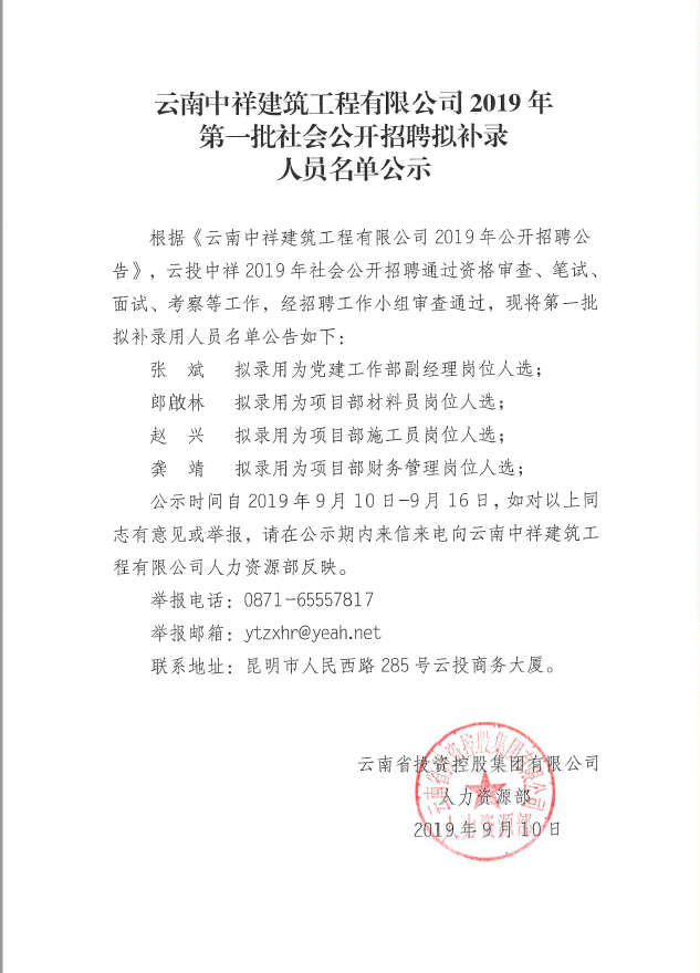云南中祥建筑工程有限公司2019年第一批社会公开招聘拟补录人员公示名单