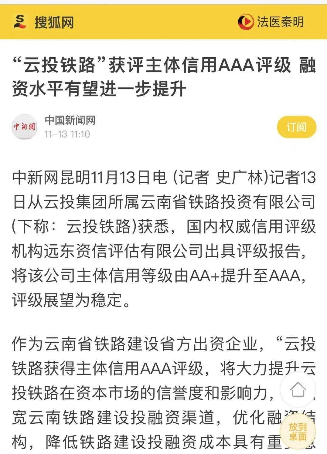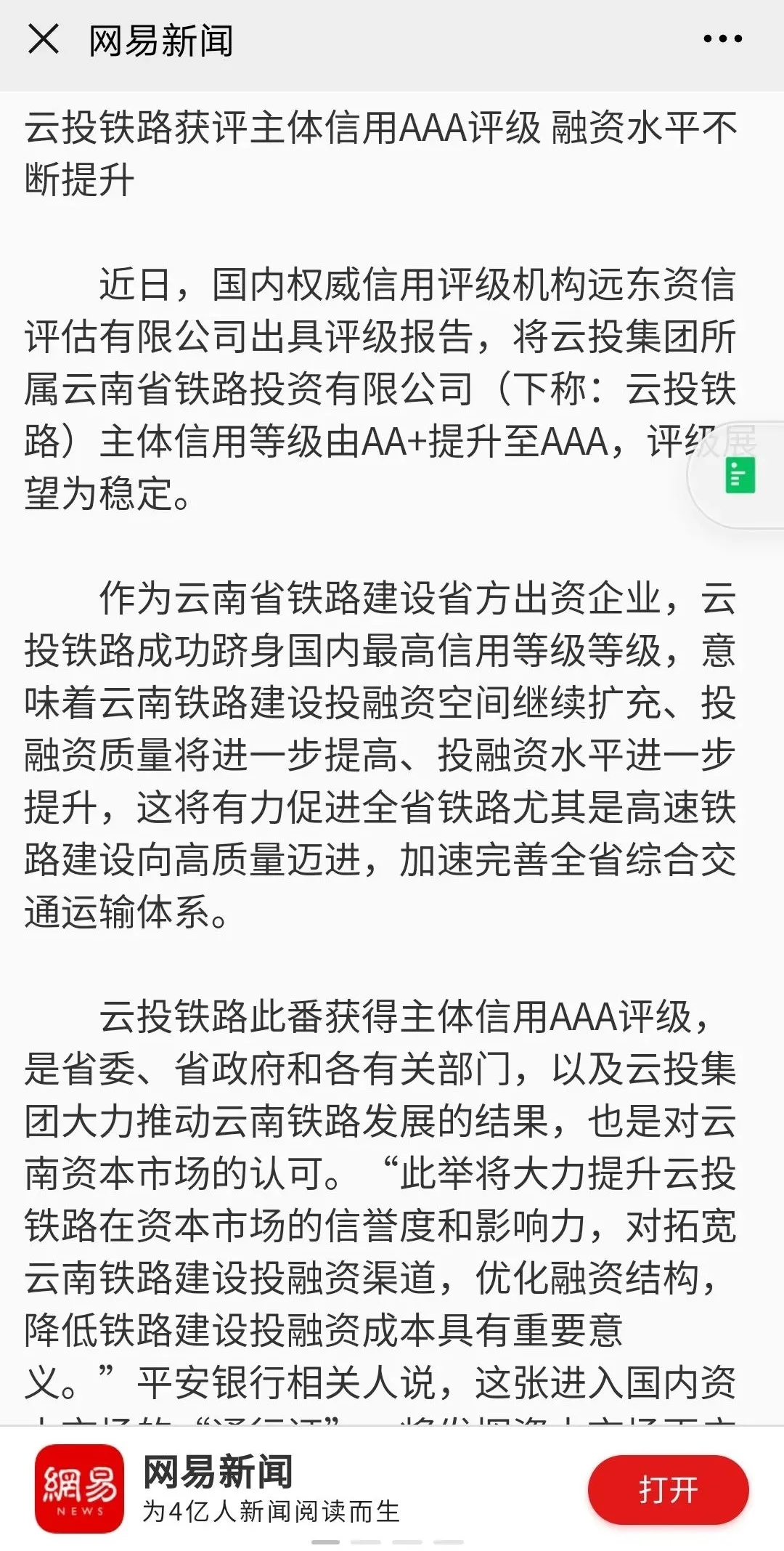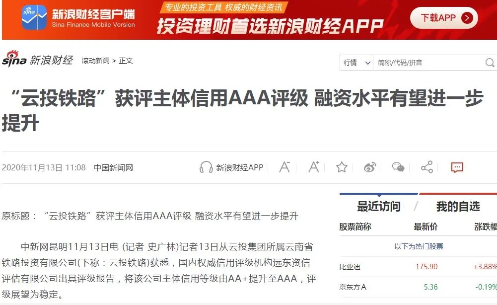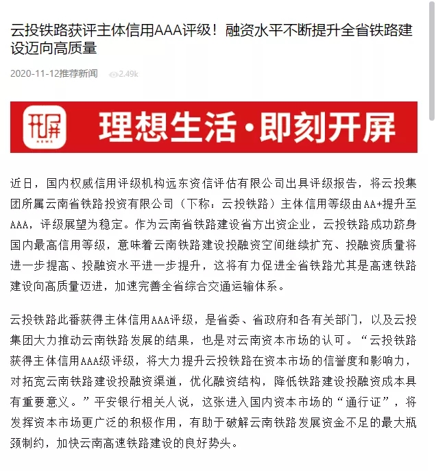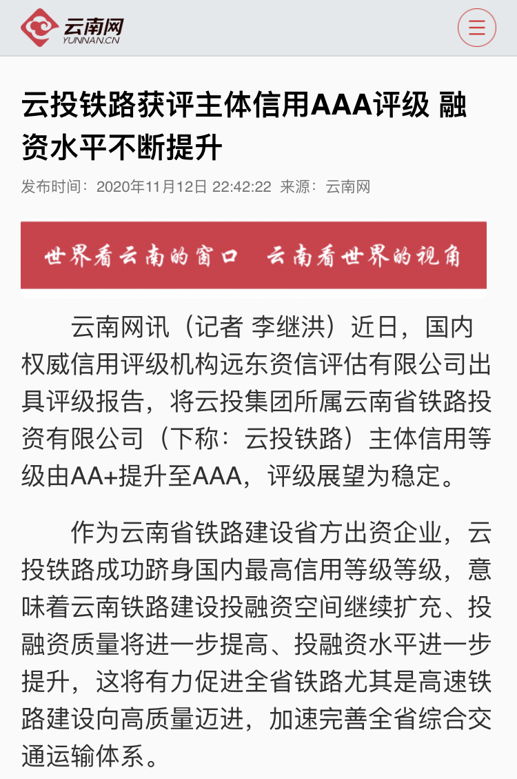 中国新闻网、中国经济新闻网、云南日报、春城晚报、今日头条等媒体对云投铁路获评主体信用AAA评级进行了报道,新浪财经、搜狐网、网易新闻对相关报道进行了转载。